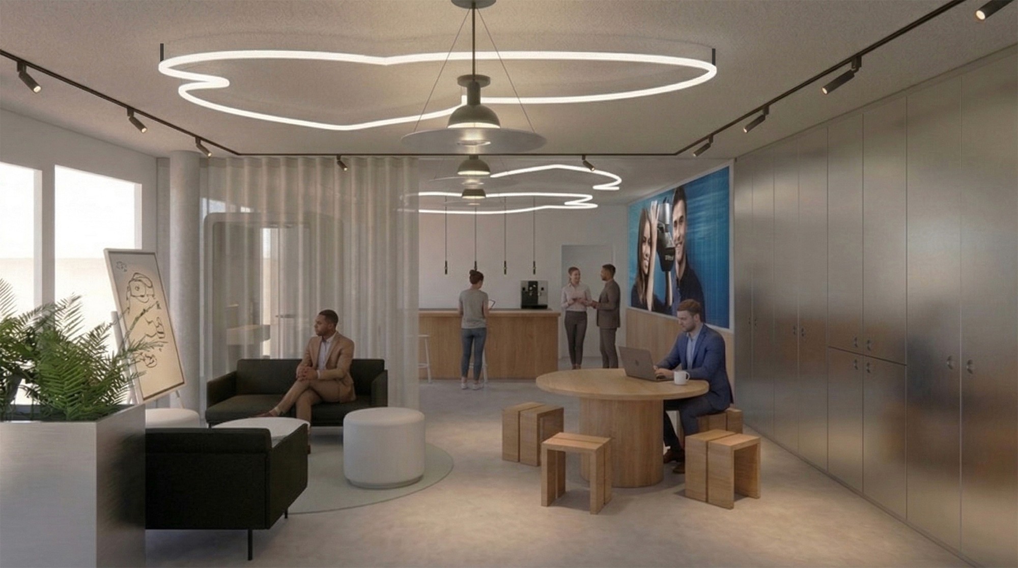 Über neun Geschossebenen hinweg entwickelten wir ein System aus architektonischen Schnittstellenelementen, das die vertikale Kommunikation im Gebäude stärkt und die einzelnen Etagen funktional wie visuell miteinander verknüpft. Ergänzt wird diese Struktur durch dezentrale Gemeinschaftsküchen, die als soziale Ankerpunkte innerhalb der Arbeitswelten fungieren.