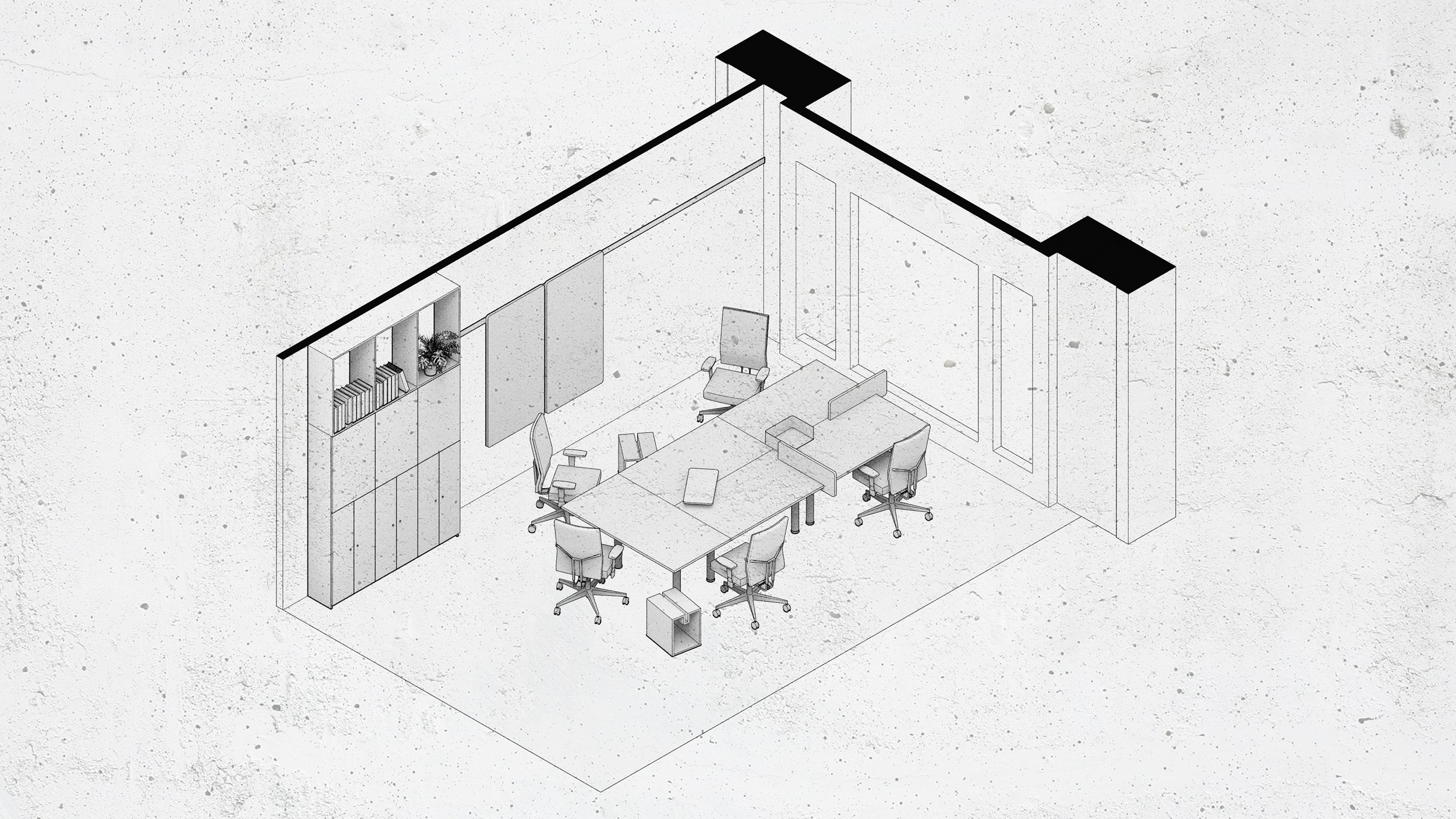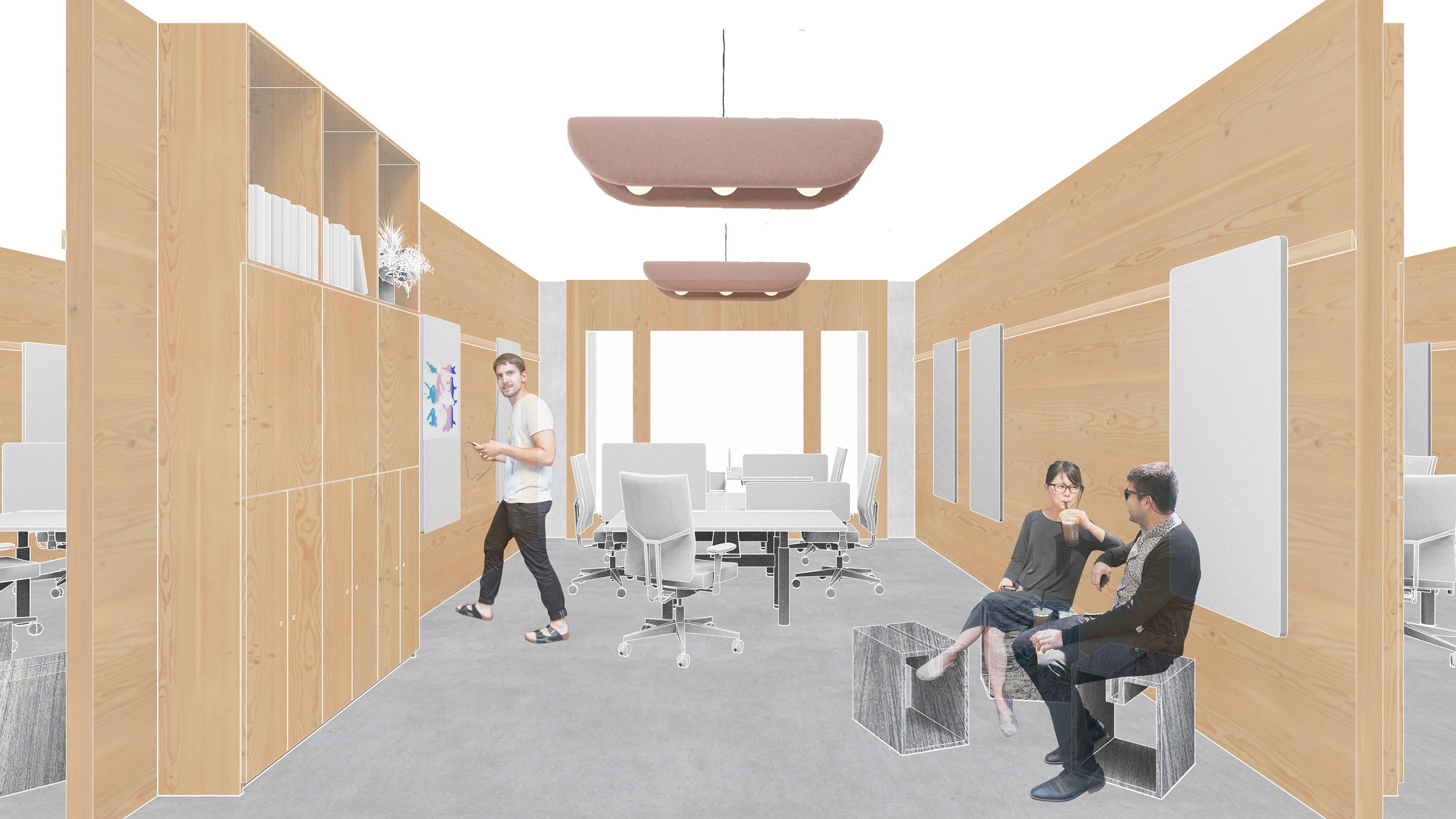 Die Ausarbeitung umfasste konzeptionelle Grundrisse, Detailüberlegungen zu Arbeitsplätzen und Gemeinschaftsbereichen sowie räumliche Darstellungen in Form von Skizzen.